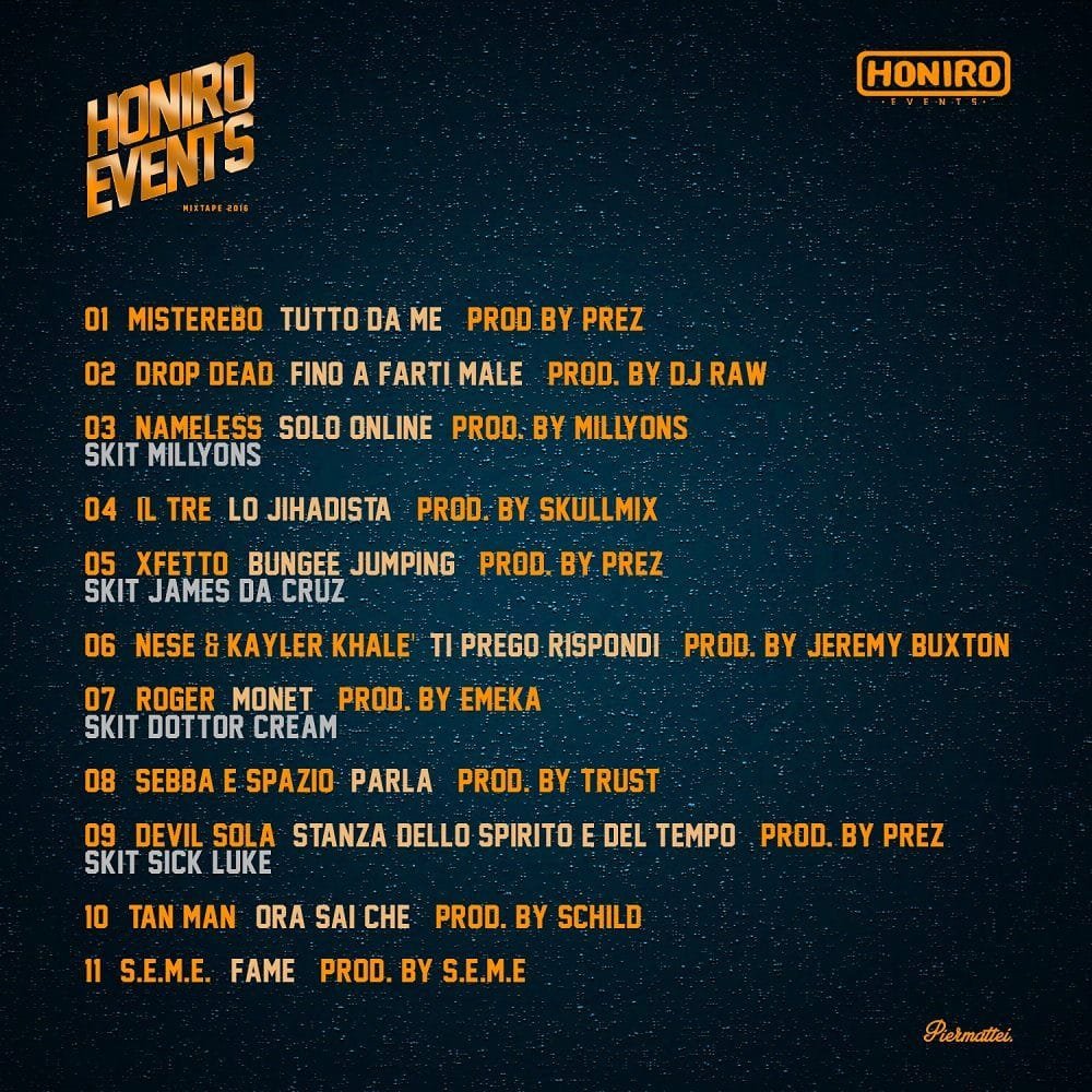 L'Honiro Events mixtape è arricchito dagli skit dei dj/producers che hanno diretto le Honiro Night dalla consolle: Millyons, James Da Cruz, Dottor Cream e Sick Luke