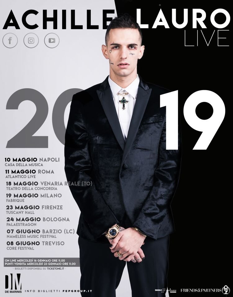 E per celebrare al meglio insieme ai suoi fan il primo semestre di questo meraviglioso anno che verrà, dal 10 maggio Achille Lauro sarà impegnato nell’“Achille Lauro Live 2019”, un tour che lo porterà sui palchi dei più importanti club d’Italia.